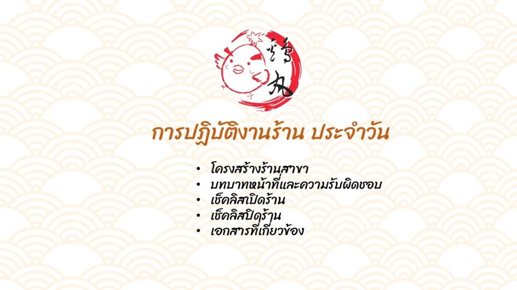 ให้ความรู้เกี่ยวกับประวัติความเป็นมาของร้าน การเติบโต คอนเซ็ปท์ร้าน กฎระเบียบพนักงาน กฎระเบียบการแต่งกาย การติดต่อสำนักงานใหญ่และการสั่งซื้อวัตถุดิบ